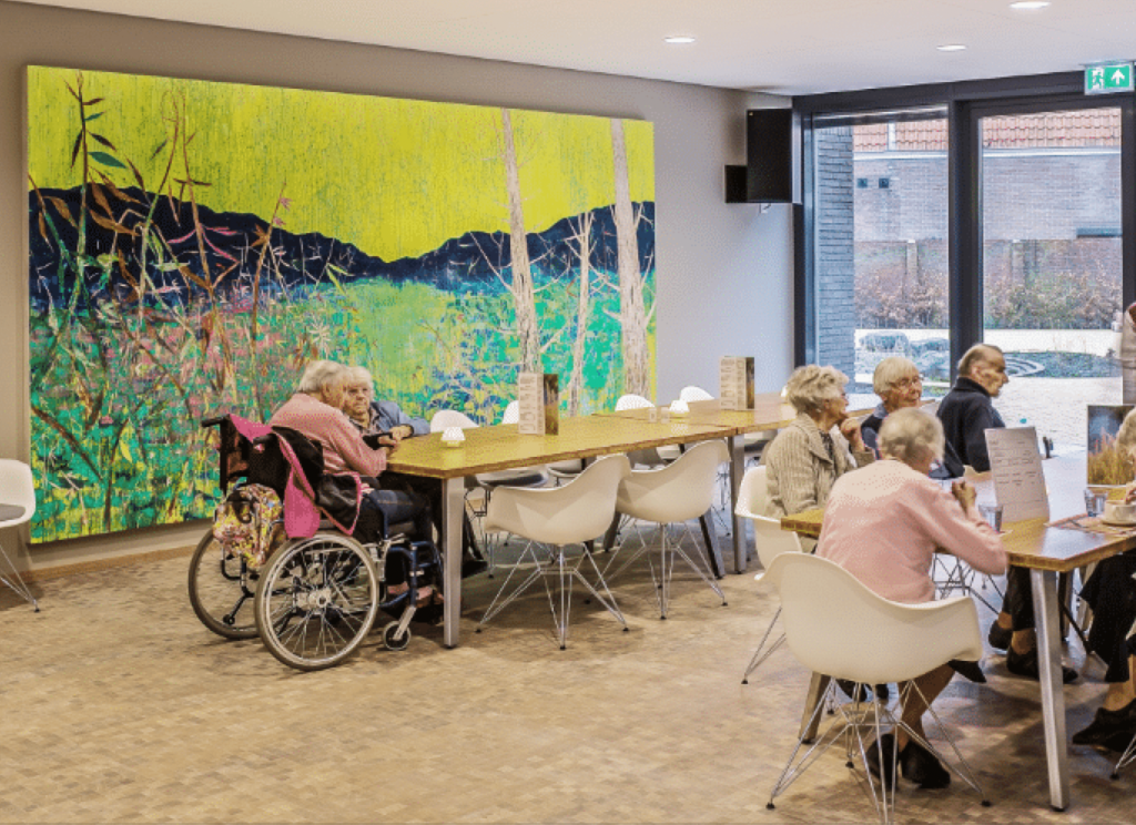 Using calm, neutral tones performing as a continuous field, proposed is a series of flora-and-fabric oriented still-lifes; articulated by evocative outlines and playful-looking foliage, gentle, brightly-hued landscapes create a feeling of joy and serenity for the residents and staff of Resthaven Care Center.